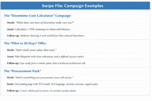 | Marketing: events + field marketing | Selective / optimized | Trust value with cost scrutiny | Account-based events; curated briefings | Spray-and-pray event calendars |