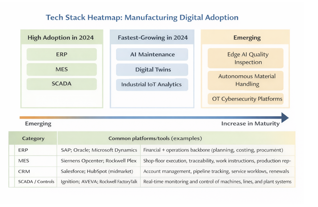 | Industrial software (MES, analytics) | Strong increase | Real-time visibility; execution control | MES modernization; OEE/quality analytics; scheduling optimization | Spreadsheets; siloed reporting; disconnected point tools |
