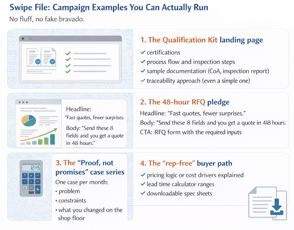 | Marketing | Make “speed of quoting” part of the brand | Launch a 48-hour RFQ pledge with a clear input checklist; track SLA performance internally; build a quoting playbook | More RFQs convert to orders; less sales churn and back-and-forth |