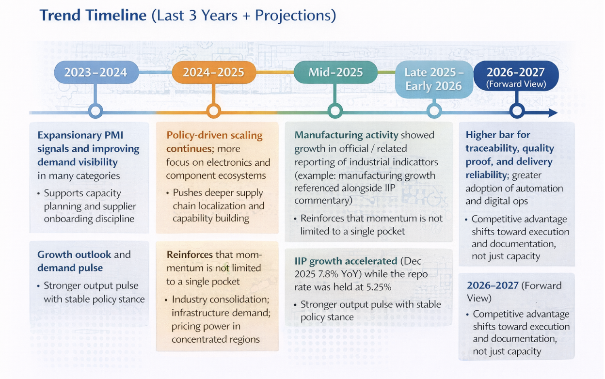 Large global buyers are diversifying beyond single-country sourcing models. India is increasingly positioned as a complementary manufacturing hub, particularly in electronics, auto components, defense, and chemicals. - Infrastructure and logistics reform