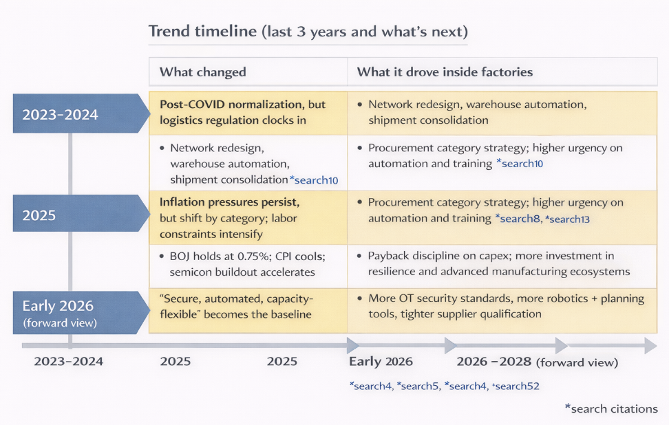 Rather than full reshoring, Japanese manufacturers are building redundancy: dual sourcing, regionalized production, and tighter supplier integration. This approach reflects lessons from COVID-era disruptions and ongoing geopolitical uncertainty.