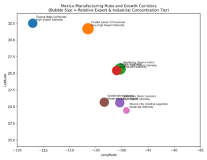 Manufacturing growth in Mexico is not evenly spread. It concentrates in corridors where the economics work: border access, intermodal connectivity, supplier depth, and labor pools. The “industrial corridors” style maps in the visuals above capture how site selectors typically frame it: Northern border, Bajío, and the broader Mexico City/central logistics basin, plus select port-linked regions.